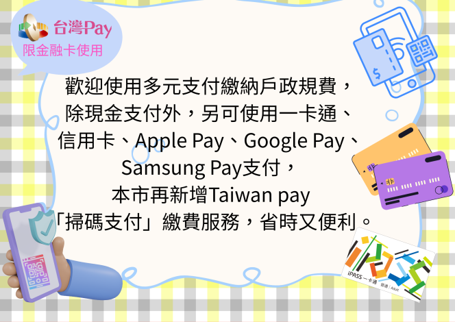歡迎使用多元支付繳納戶政規費,除現金支付外另可使用一卡通、信用卡、Apple Pay、Google Pay、Samsung Pay支付,本市再新增Taiwan pay「掃碼支付」限綁定金融卡繳費服務,省時又便利。