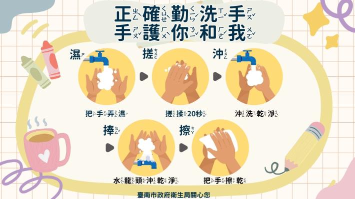 (二)正確勤洗手,手護你和我!腸病毒、流感等病毒經由手部傳播,正確洗手是最有效的預防方式!請記住洗手5步驟,用肥皂搓洗雙手至少20秒,讓細菌病毒無處可藏!守護自己與家人的健康,從洗手做起!